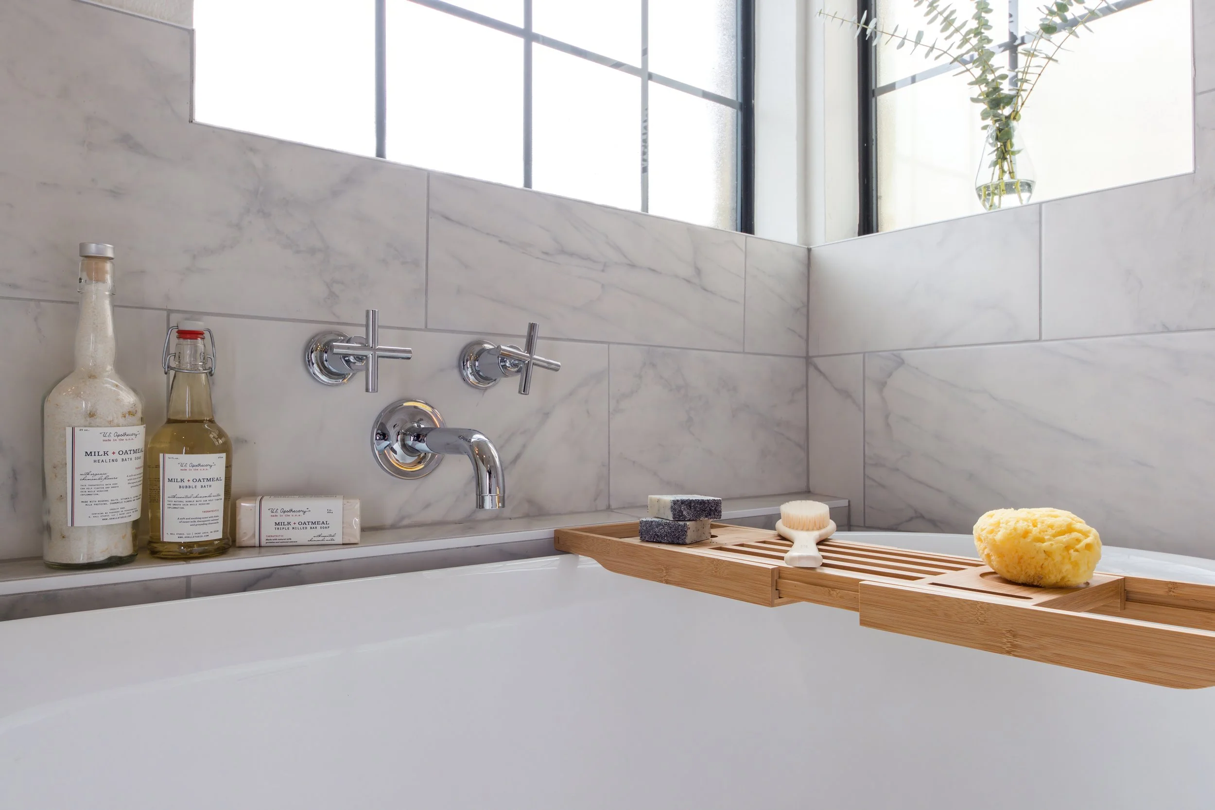 A previously unused bathroom was reimagined into a guest powder bath that feels more private and accessible, while the primary bathroom was redesigned to better serve both homeowners.